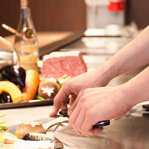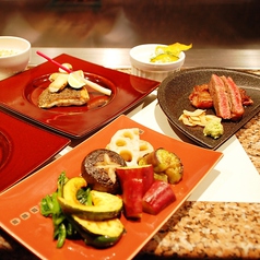 ランチメニュー ランチ時は数量限定のハンバーグコースを含む6種類をご用意致しました。 ディナーメニュー 旬の魚介類や極上の和牛、旬の野菜をお客様の目の前で豪快に調理。 コースメニュー ご予算や要望に応じて、3つのコース料理をご用意しております。